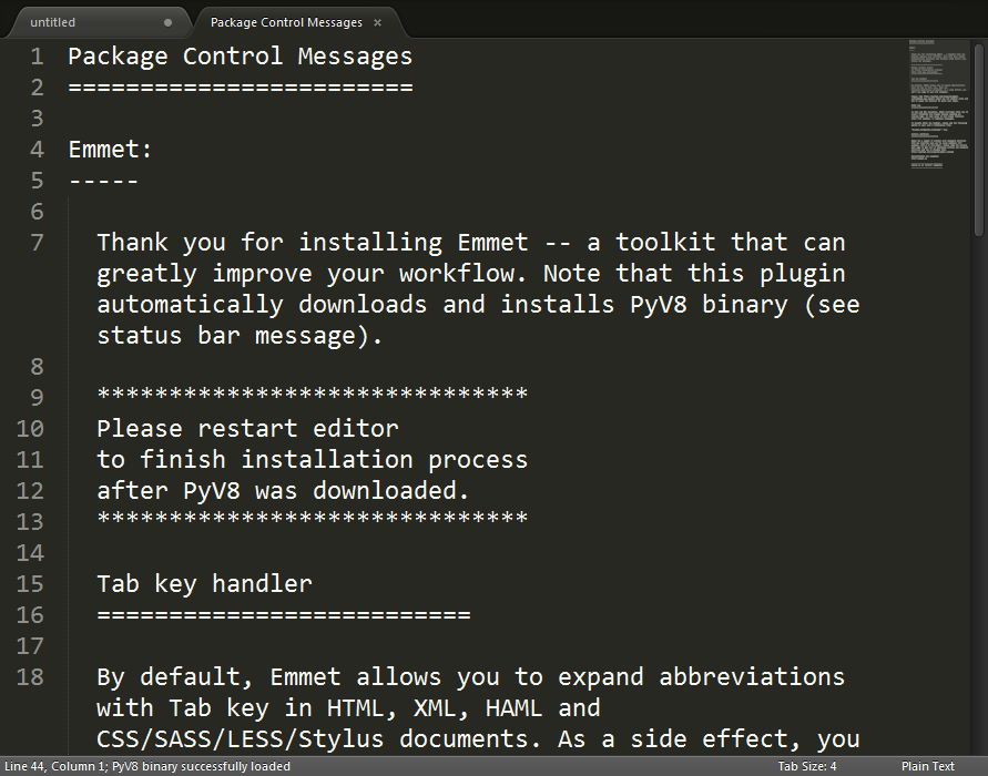 インストールが完了すると「Emmetをインストールしてくれてありがとう」の英文が表示されるので、一度SublimeText2を再起動すれば、無事にEmmetが使えるようになっているかと思います。